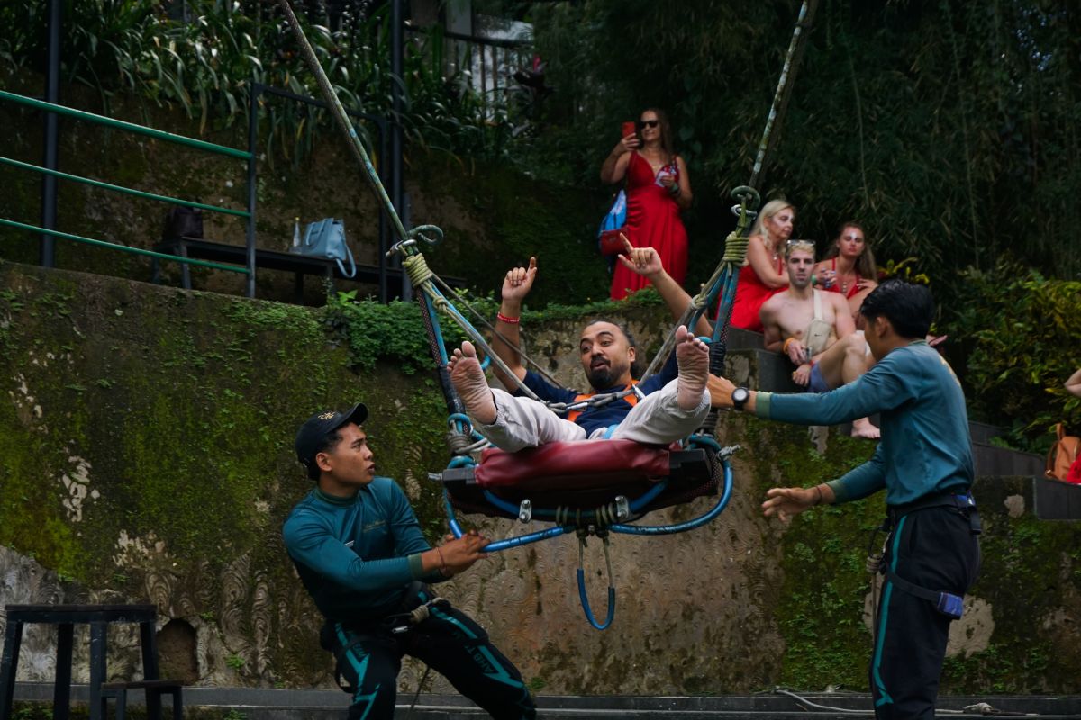 Para peserta juga merasakan sensasi wahana ayunan dan mencicipi kopi di Alas Harum. Mereka menikmati “high tea” di Omma Dayclub dengan latar belakang Air Terjun Tegenungan yang menawan.